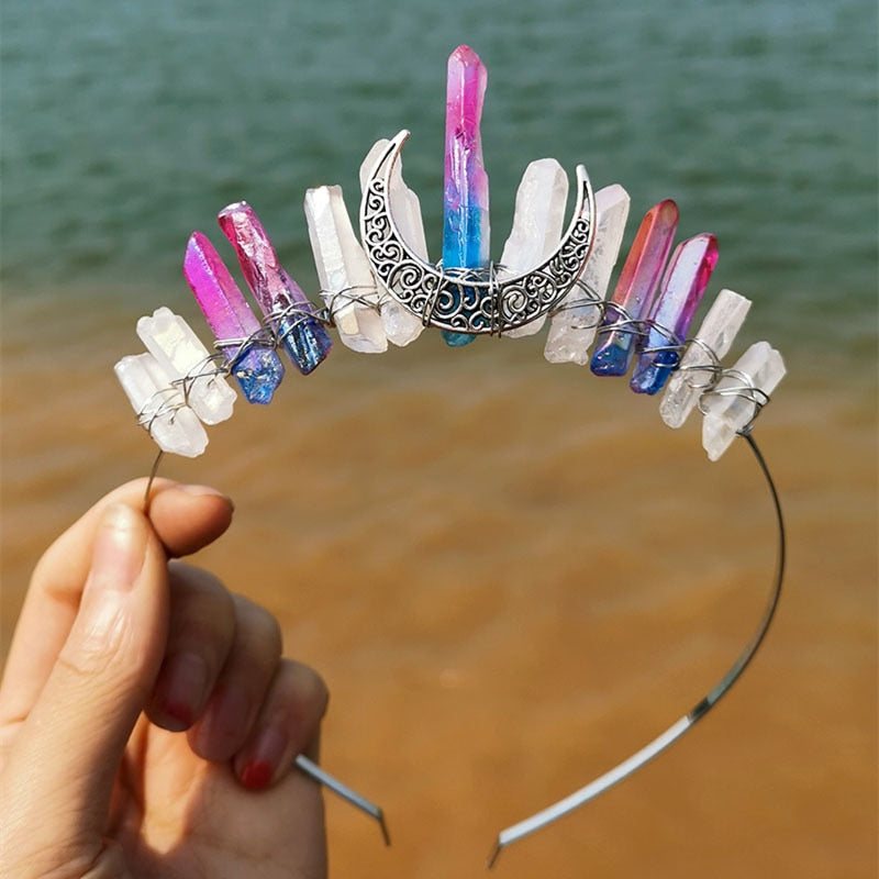 Natural Crystal Witch Crown Hair Accessories Multicolored Crystal Headwear Moon Bridal Headband Handmade Fashion Jewelry Gifts