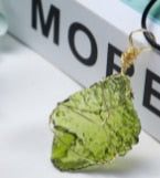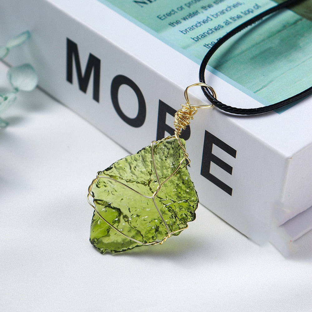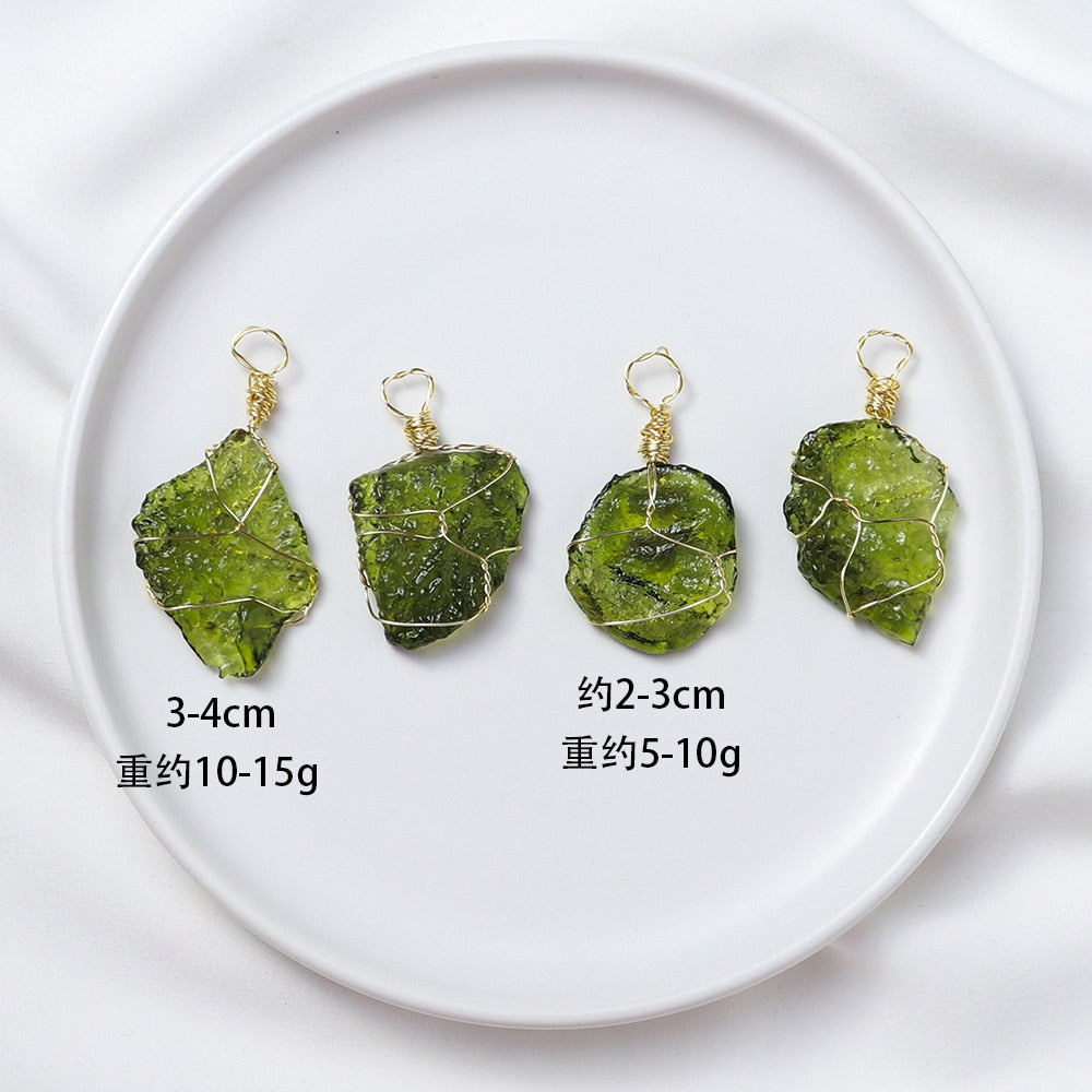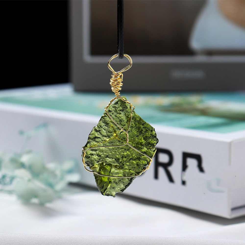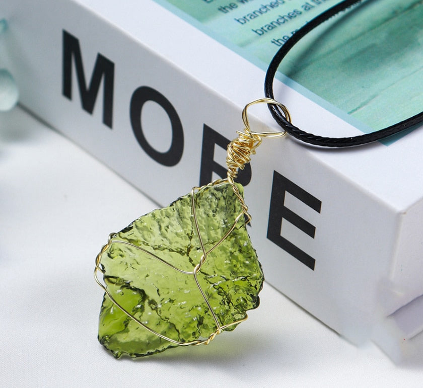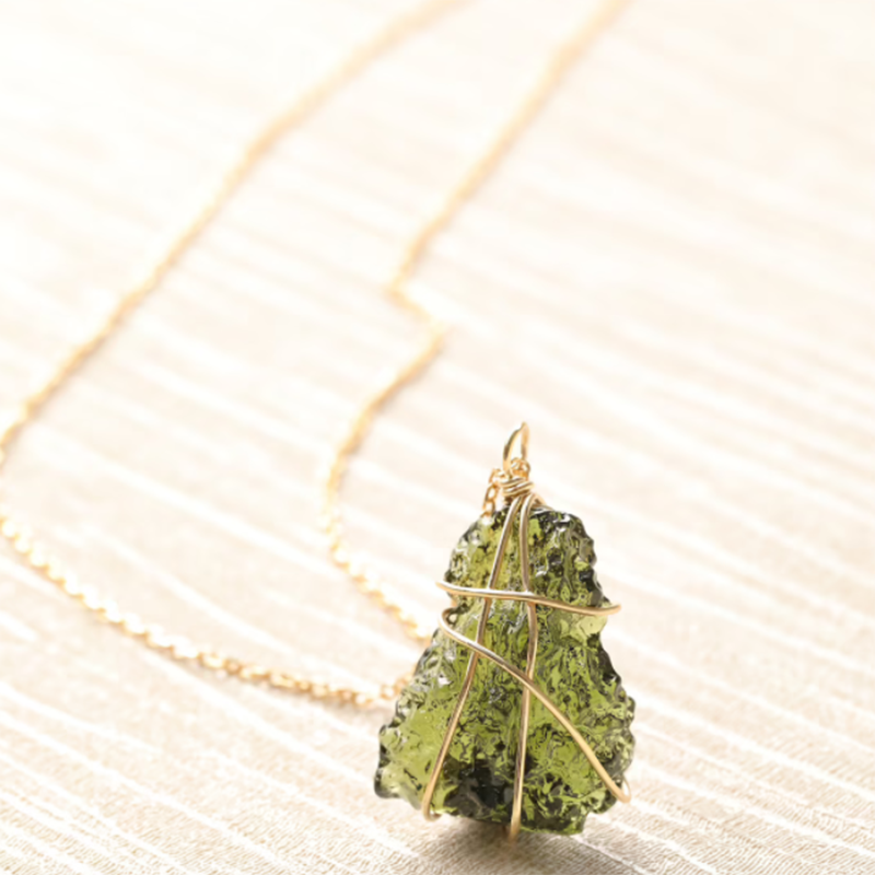 Natural Raw Moldavite Pendant Czech Meteorite Necklace with Goldtone Wire Wrap Irregular Crystals Certified 100% Real Moldavite