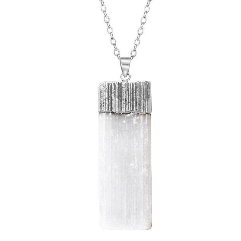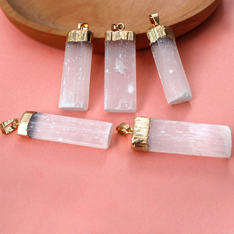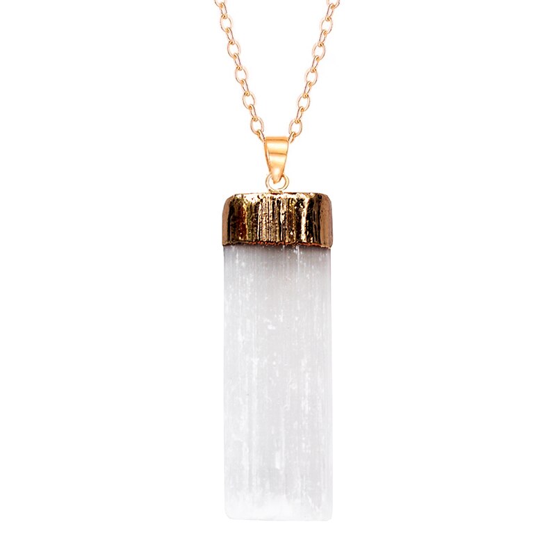 Natural White Selenite Healing Crystal for Women Men Gold Silver Plated Rough Gypsum Stone Pendant Necklace